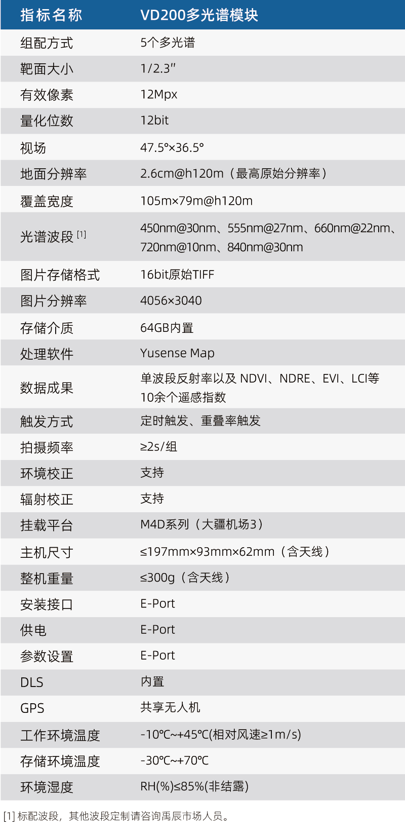 VD200多光谱模块有效像素1200W,原始分辨率高达2.6cm@120m,波段覆盖450nm、555nm、660nm、720nm、840nm,满足农田、森林、河湖岸线等场景的精细化监测需求。同时标配DLS下行光传感器与标准漫反射板,保证相对光谱反射率测量误差≤10%。
