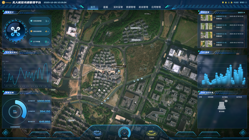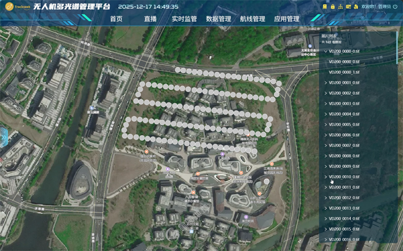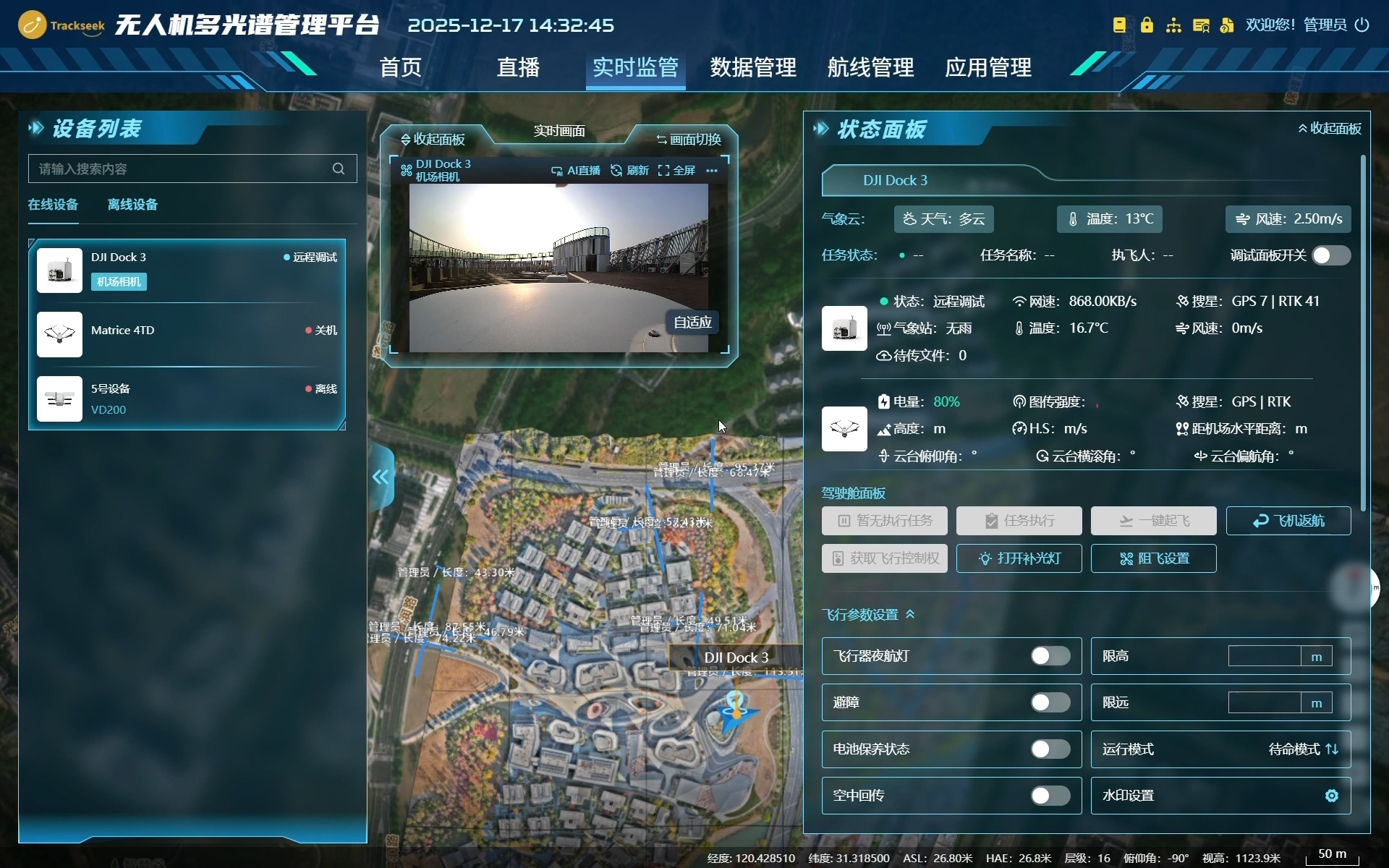 智慧管理系统平台包括无人机管理平台与多光谱数据拼接中台,其中无人机管理平台负责飞行控制、航线规划,多光谱数据拼接中台负责VD200多光谱模块系统状态监控、数据回收与数据分发处理。