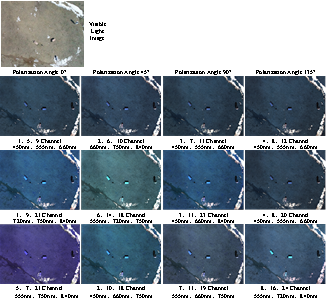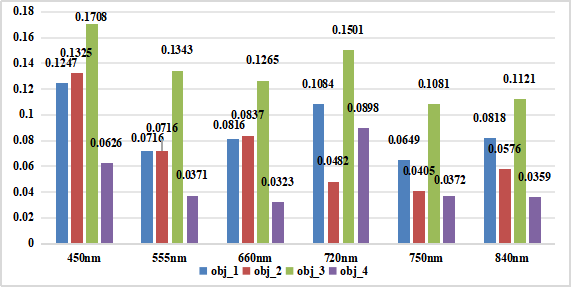 结果显示:基于不同偏振光谱通道数据,原本可见光下的同色难分辨目标,在不同偏振-光谱组合伪色彩下,背景-目标视觉对比度有显著提升,更有利于目标检测任务。2.不同背景-目标偏振度参数在450nm、555nm、660nm、720nm、750nm、840nm 6个波段上的差异,为复杂背景下目标区分的敏感波段选取设计提供支撑。