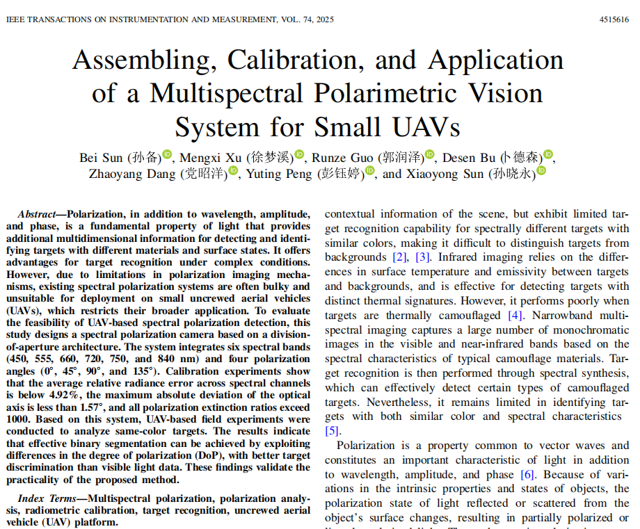 [1]论文信息:Bei Sun, MengXi Xu, RunZe Guo, et al., Assembling, Calibration, and Application of a Multispectral Polarimetric Vision System for Small UAVs. IEEE Transactions on Instrumentation and Measurement, vol. 74, pp. 1-16, 2025,