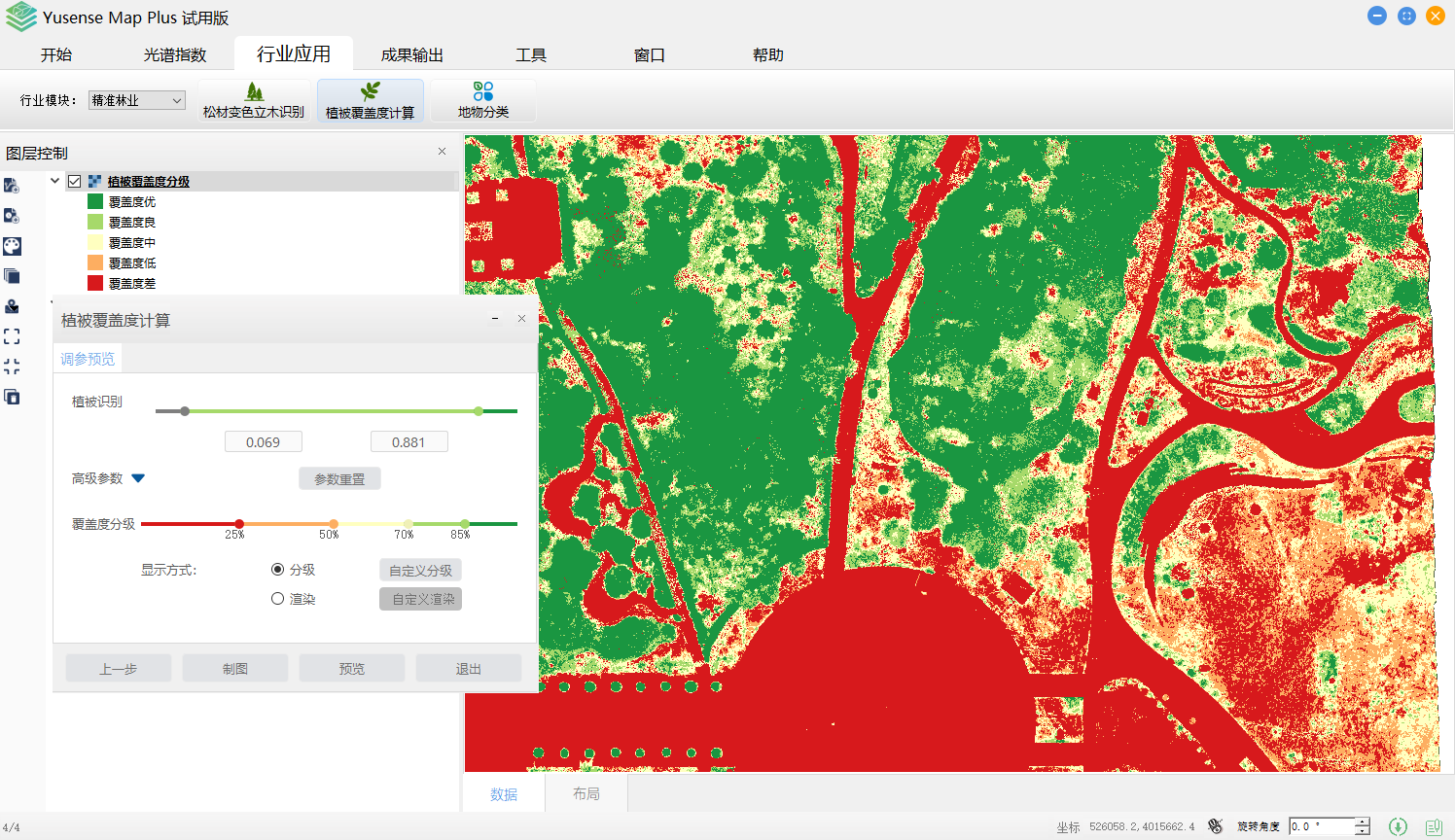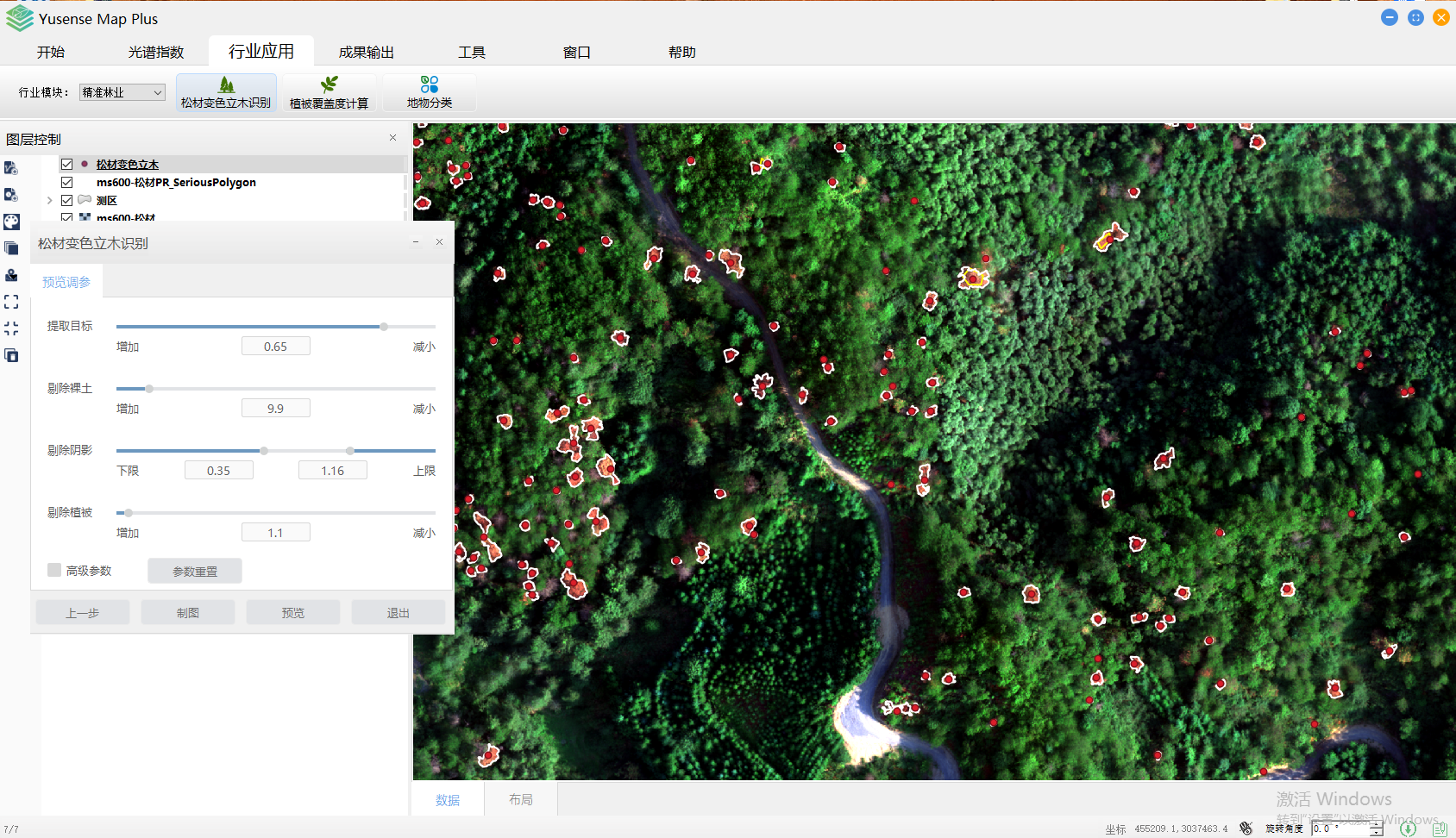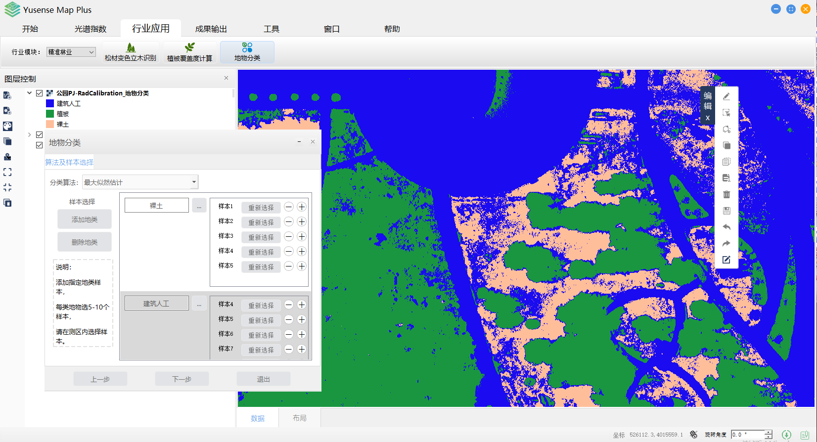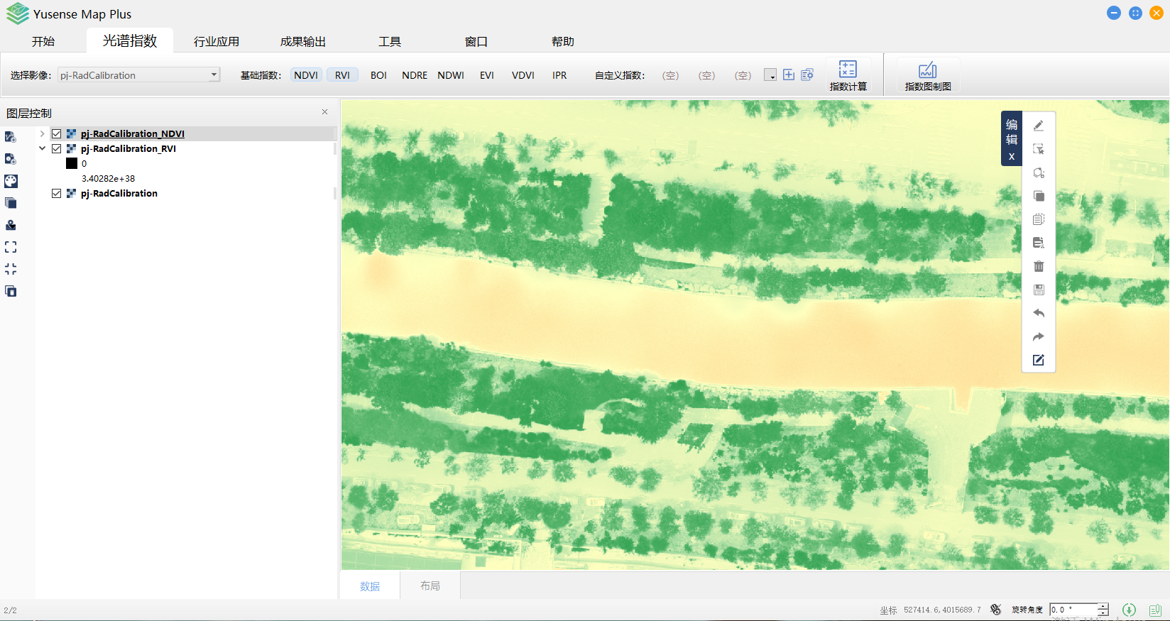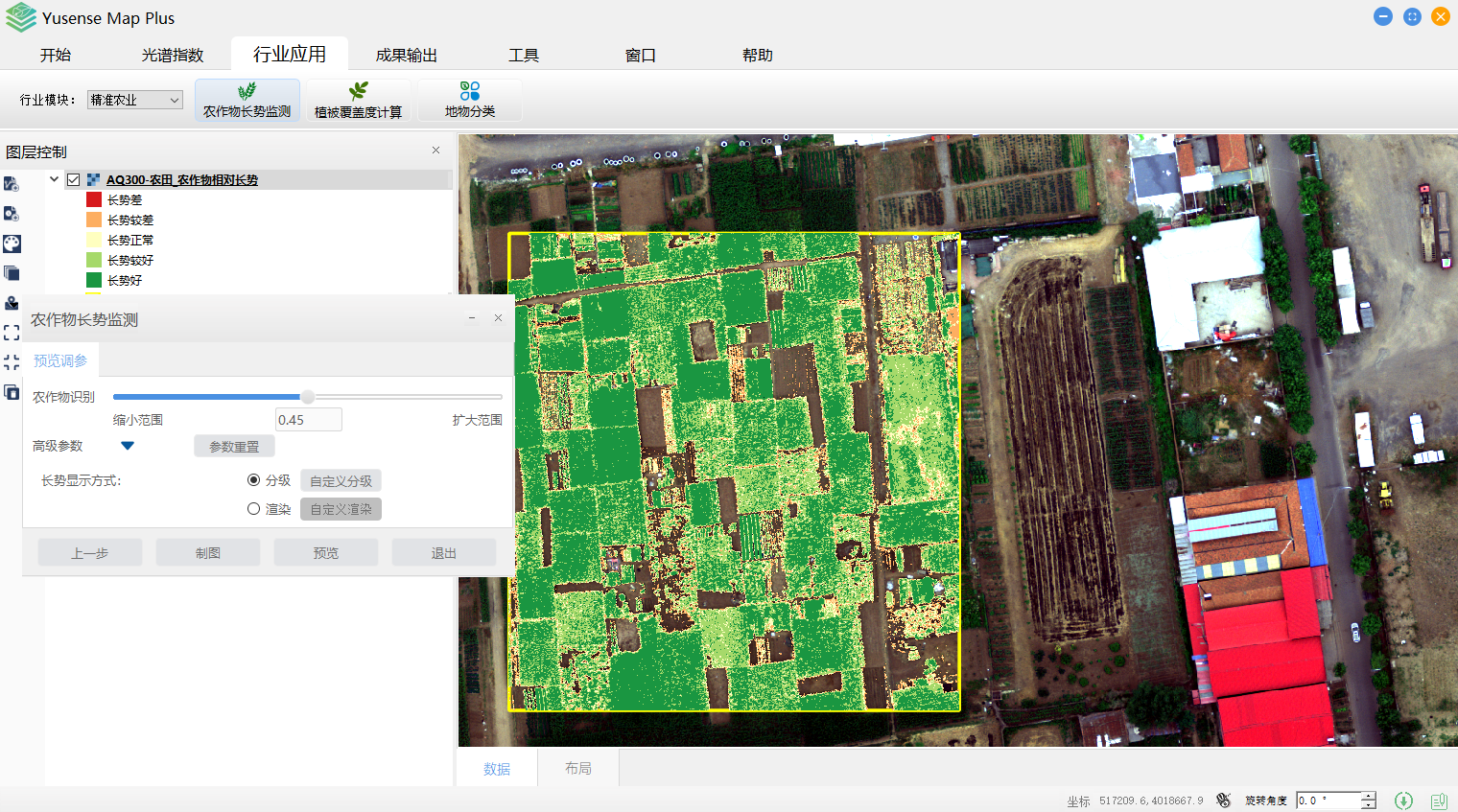Yusense Map Plus是一款专业的多光谱数据行业应用软件,主要面向无人机遥感行业用户,可通过简单便捷的操作完成目标分析、识别及成果输出等一系列流程化处理,覆盖农作物长势监测、松材变色立木识别、植被覆盖度计算、水面线提取、水体富营养化分析、黑臭水污染分析、地物分类等典型行业应用。